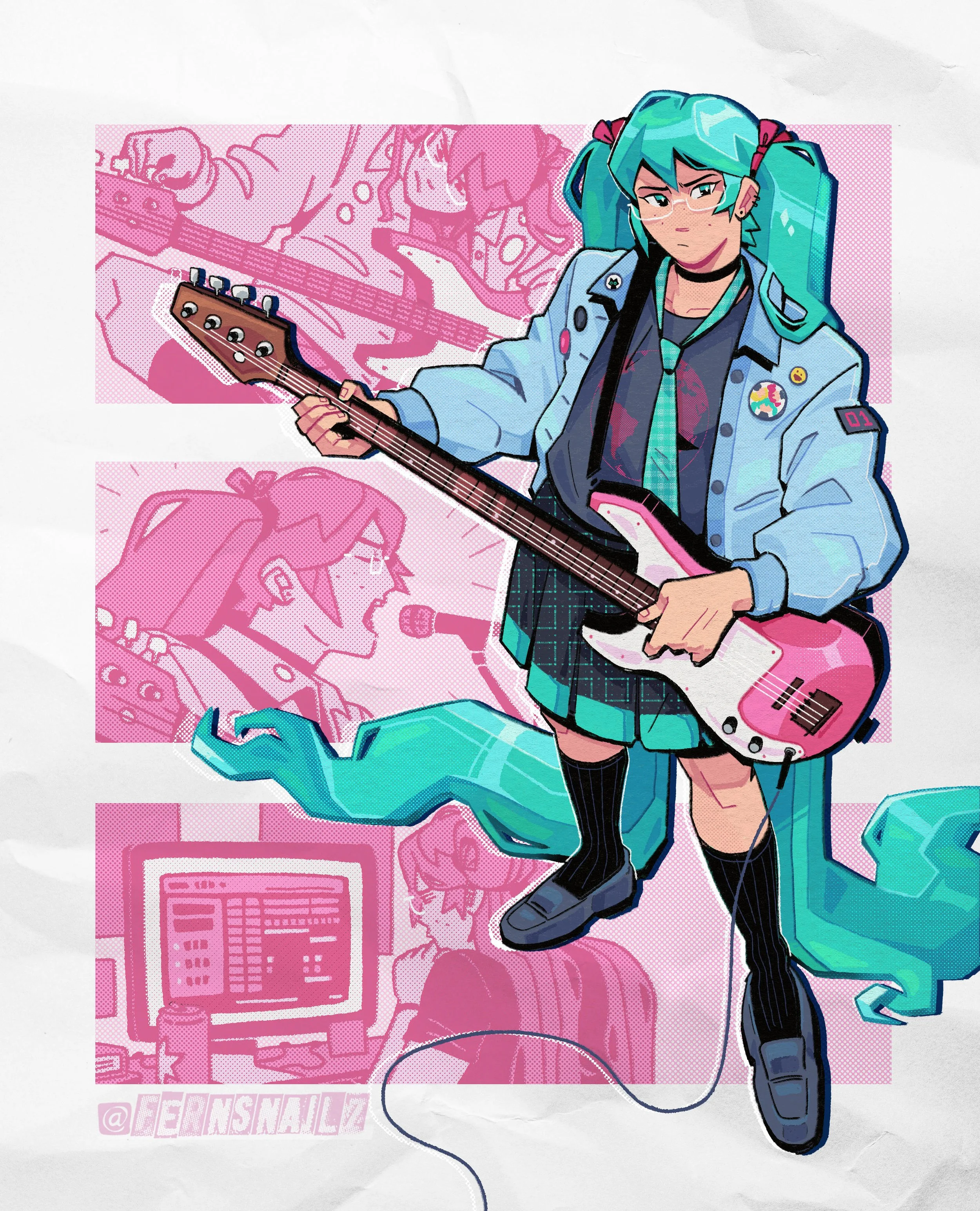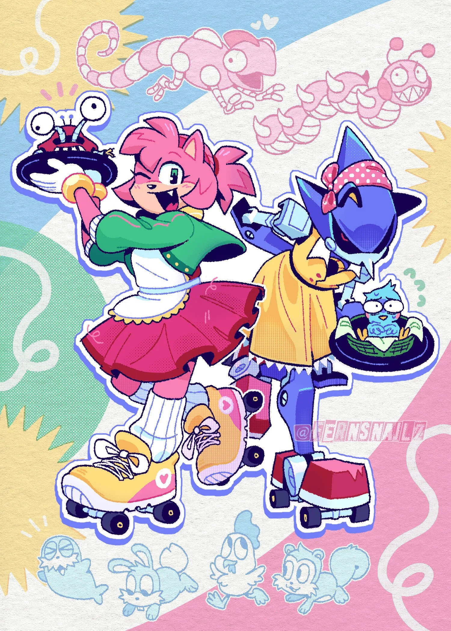 46 pages of artwork, sketches, and comics featuring various robots from the Sonic series. Zine is 5.8x8.3in with a matte cover and is saddle stitch (staple) bound.